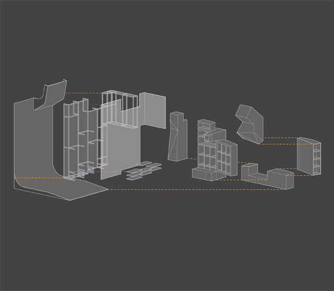 Having secured a retail space in the popular Active Ride Shop chain store, Elwood Clothing needed cabinetry design for their allotted build-out. Like the trade show booth, the build-out was a retail venue of its own, placed amongst the build-outs of other retailers. Part of the task was to distinguish the Elwood space from the these other spaces. Drawing on urban youth imagery of skateboard ramps, transformers, and old music equipment trunks, the Elwood build-out was composed of three basic elements: a light box, wardrobe "cabinetry" and a skateboard ramp / platform.